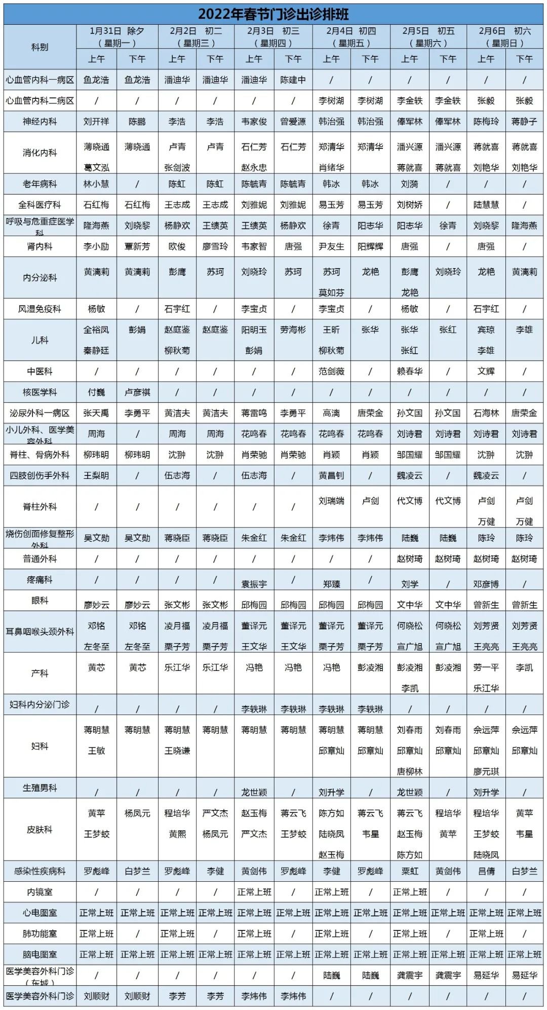为给大家提供健康保障,桂医附院实行无假日医院制度,急诊、发热门诊全年每天24小时开诊,门诊全年正常开诊(大年初一除外),以下是桂医附院2022年春节期间门诊排班: