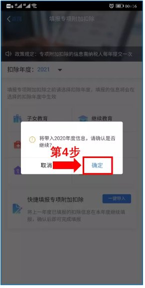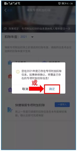 第四步:页面会跳出【将带入2020年度信息,请确认是否继续?】或者【您在2021年度已存在专项附加扣除信息,如果继续确认,将覆盖已存在的专项附加扣除信息!】,考虑确认后点击【确定】。