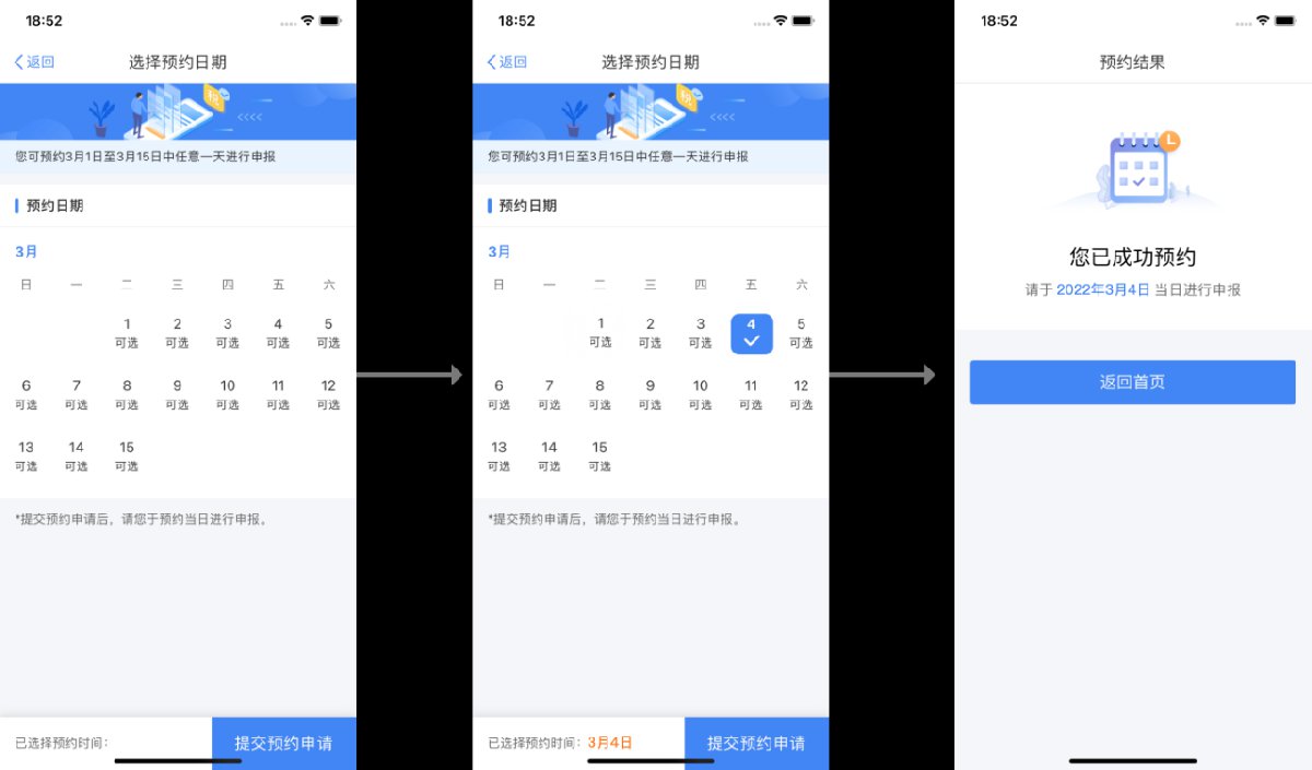 成功预约后,您可通过“首页-2021综合所得年度汇算专题区域”点击“查看预约”进入“我的预约”页面,该页面可查看到您所预约的具体日期,如下图所示: