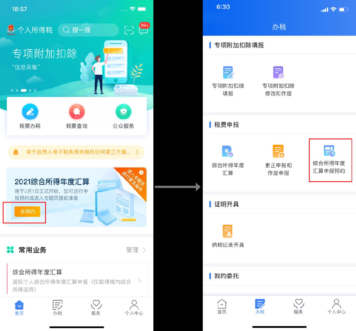 打开个税APP,若您还未预约,可通过“首页-2021综合所得年度汇算专题区域”点击“去预约”进入预约功能页面,也可以通过“我要办税/办税-综合所得年度汇算申报预约”进入预约功能页面,如下所示: