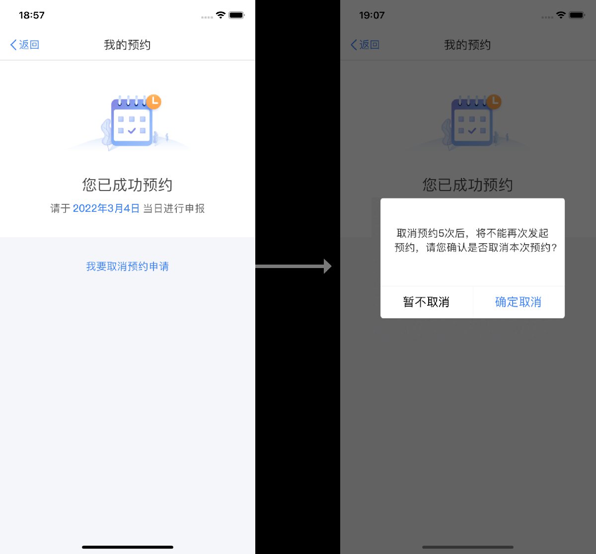 在所选的日期之前,您也可以通过该页面上的“我要取消预约申请”按钮取消您的预约。取消成功后,可重新发起预约。