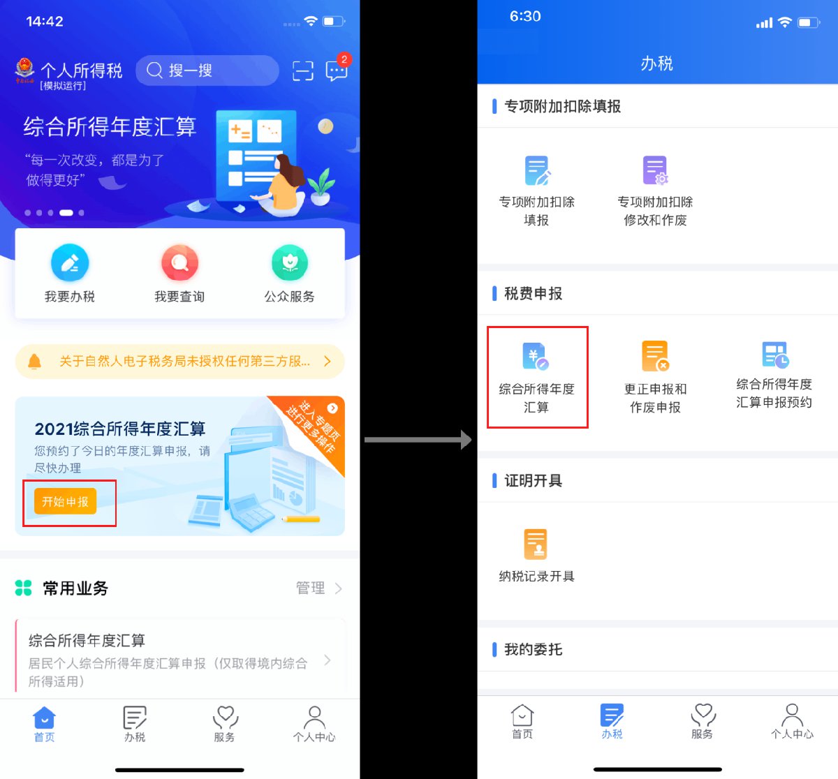 打开个税APP,您可通过“首页-2021综合所得年度汇算专题区域”点击“开始申报”,或通过“我要办税/办税-综合所得年度汇算”发起申报,如下图所示:
