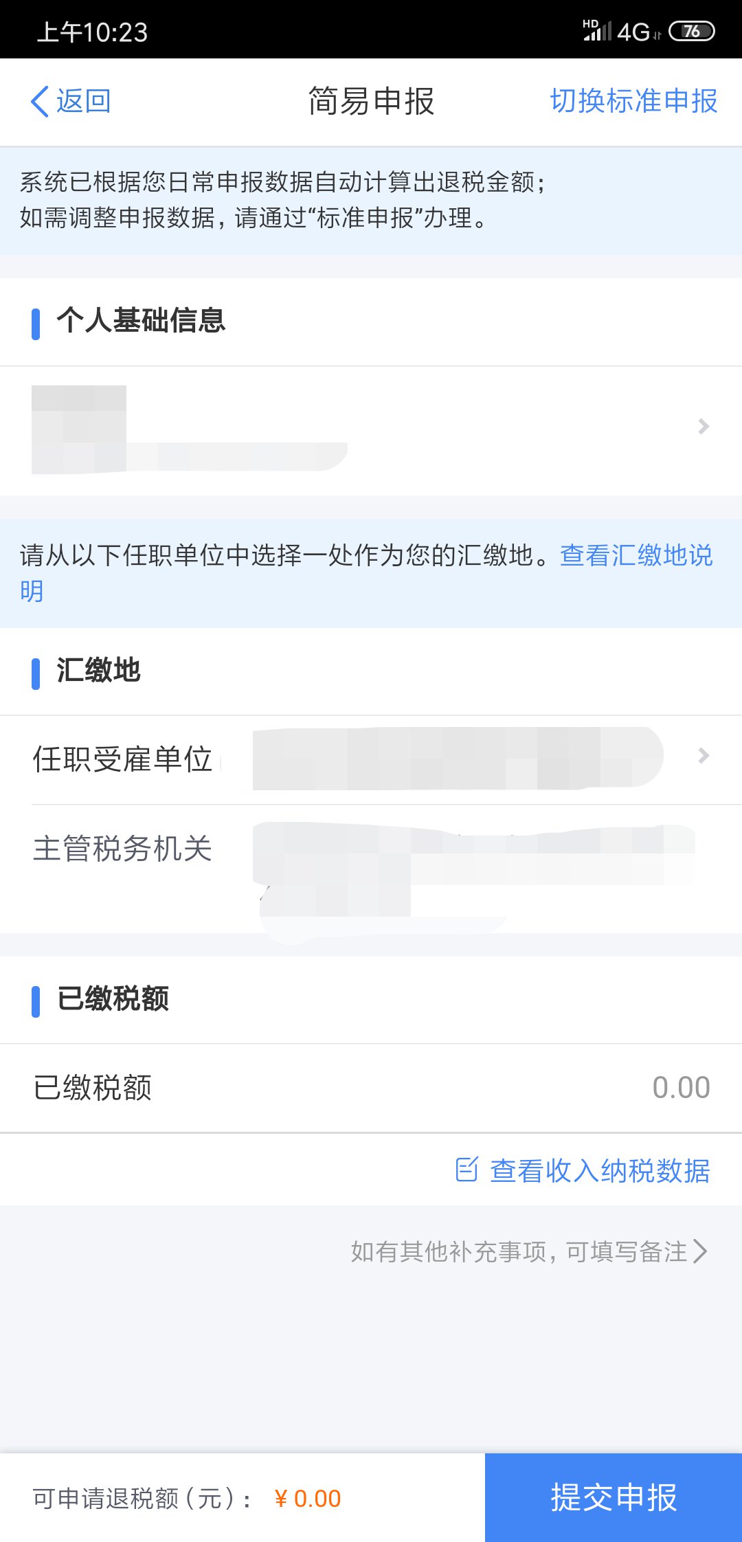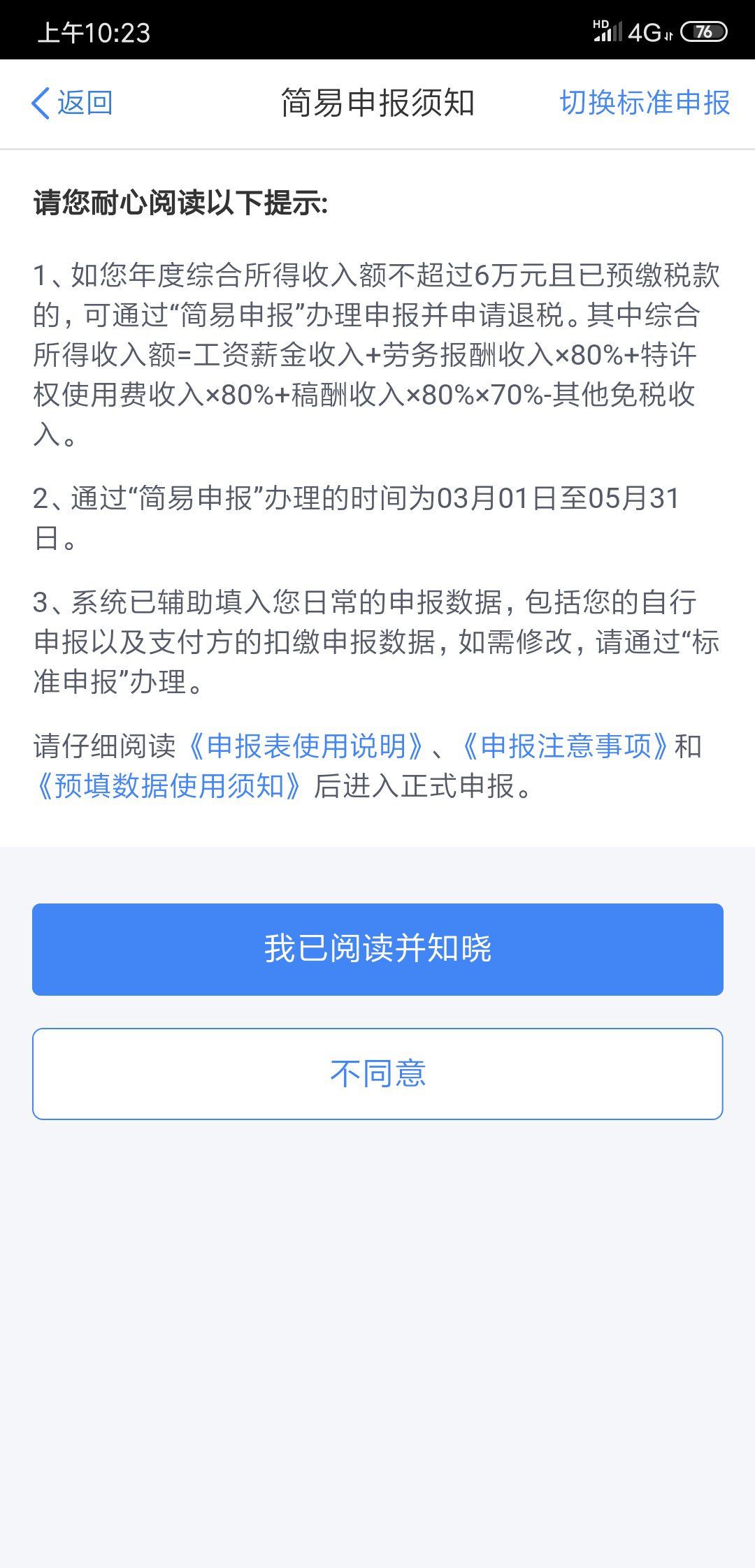 第四步:然后会进入一个让你阅读协议的界面,等待几秒钟之后,就会出现各种已经默认的数字,反正一般人也看不懂全面的,看个大概就行了,然后选择下一步,最终可以在左下方看见自己一年的纳税数据,还有最终可以看到自己应该退税多少钱或者补交多少钱。