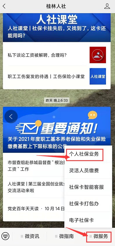 第一步:关注“桂林人社”公众号,点击菜单栏“微服务”——“个人社保业务”