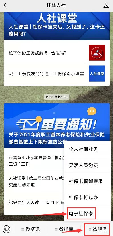 第一步:关注“桂林人社”公众号,点击菜单栏“微服务”——“电子社保卡”,即可进入申领页面