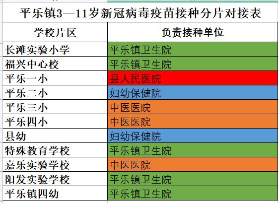 其中平乐镇辖区3-11岁儿童由县人民医院、县中医院、县保健院、平乐镇卫生院四个医疗机构分片包干所对应的学校,托幼机构,自主合理分校分班有序安排接种;