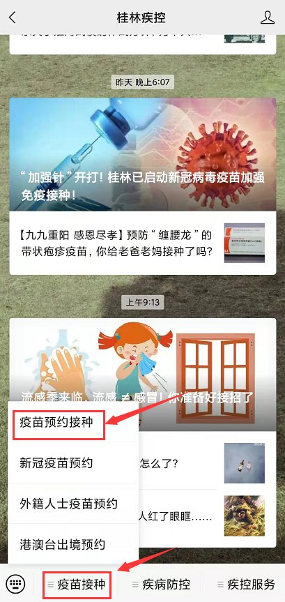 步骤一:关注“桂林疾控”,点击菜单栏“疫苗接种”——“疫苗预约接种”