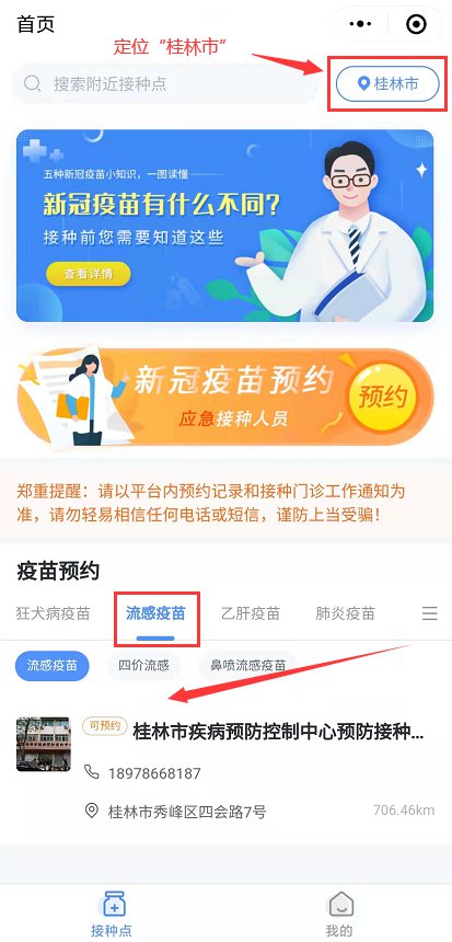 步骤二:进入主页,定位“桂林市”,选择流感疫苗