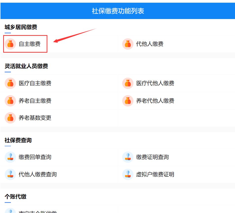 第三步:注册个人信息后,进入社保缴费功能列表,点击“城乡居民缴费”——“自主缴费”