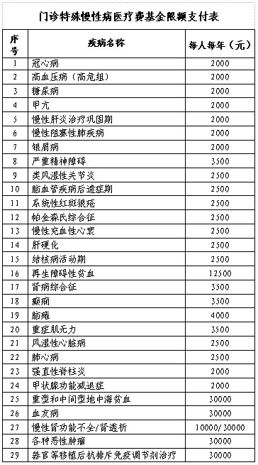 (一)病种范围。全区统一确定冠心病等29种疾病为门诊特殊慢性病,详见门诊特殊慢性病医疗费基金限额支付表。