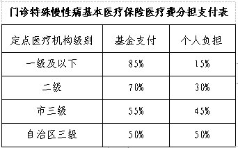 (五)医疗费报销比例。门诊特殊慢性病患者在定点医疗机构门诊发生符合基本医疗保险支付范围的医疗费用,由基金与个人双方分担,详见门诊特殊慢性病基本医疗保险医疗费分担支付表。