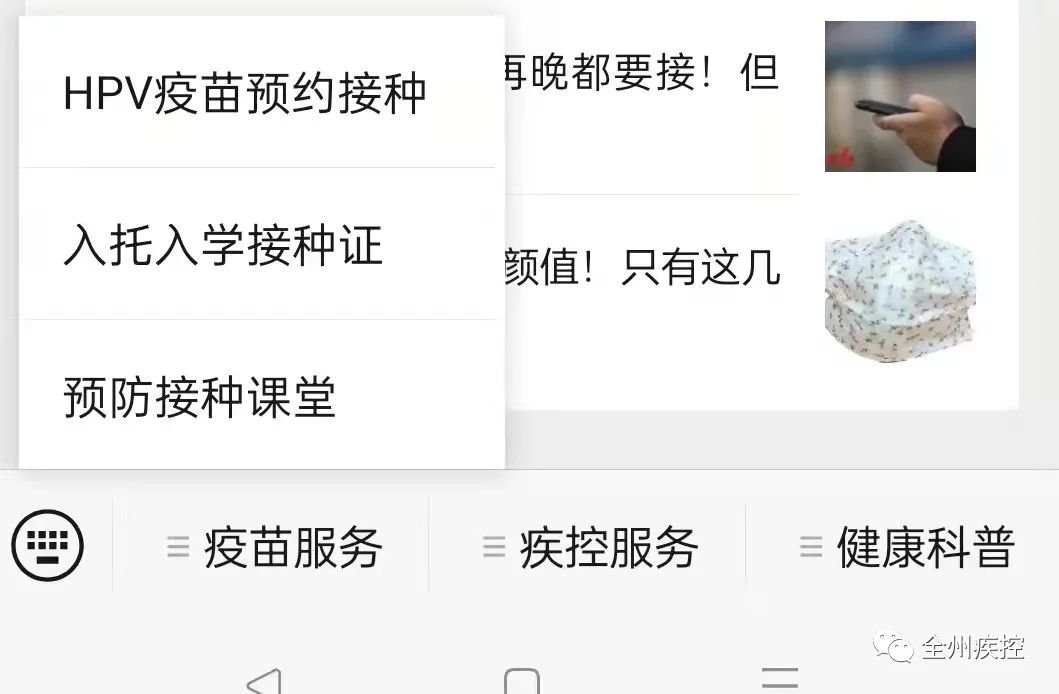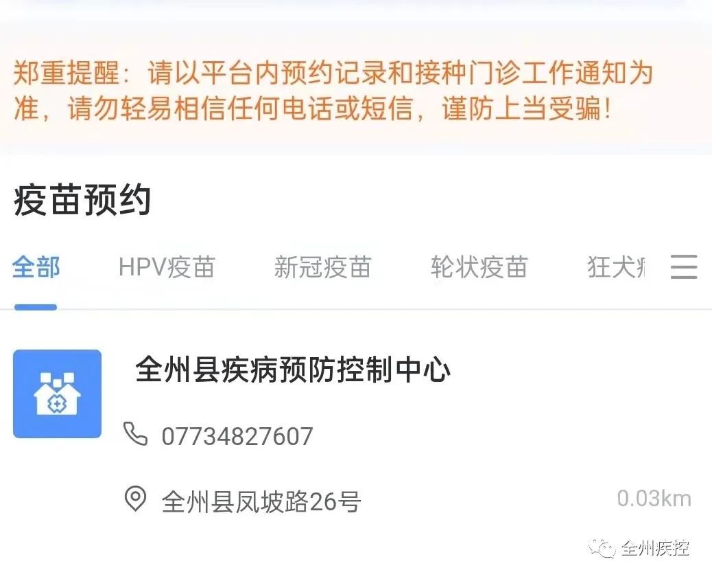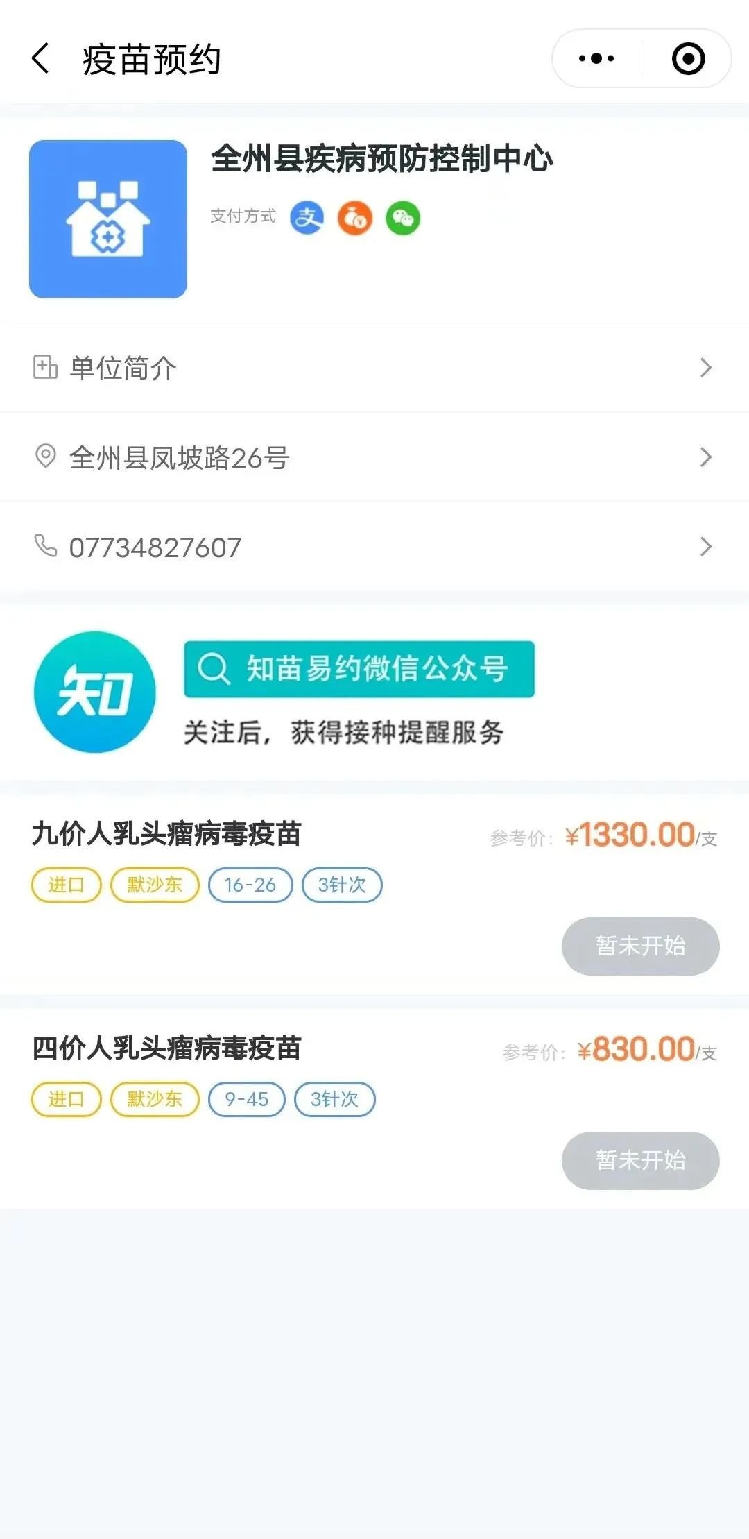 2.请符合条件预约的居民朋友在“全州县疾病预防控制中心”微信公众号上“九价人乳头瘤病毒疫苗”(针对首针预约)项目进行预约,不认可其他网络APP预约途径。”