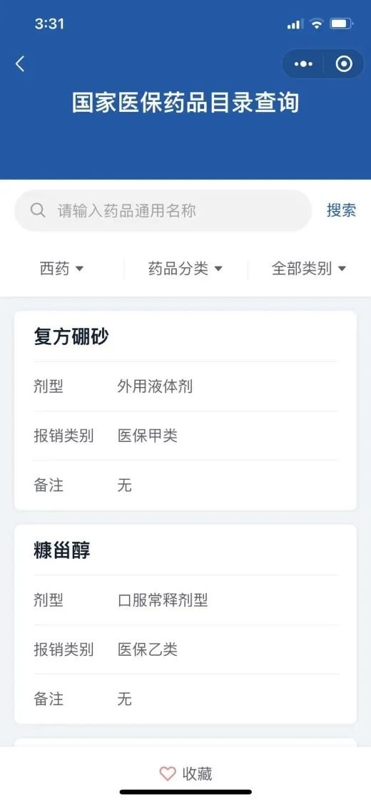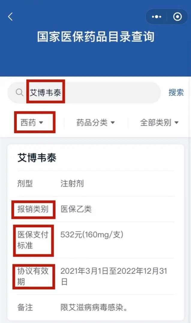 ➤输入药品名称,选择“西药”、“中成药”或“中药饮片”,即可了解该药品包括“报销类别、医保支付标准、协议有效期”等详细信息。
