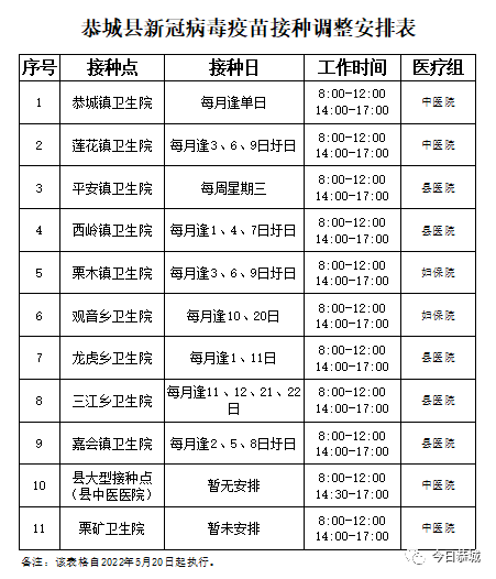 请各乡(镇)疫情防控指挥部做好宣传工作,按各接种点排班时间组织接种人员按时到接种点接种,避免群众跑空、跑冤枉路;各医疗卫生单位做好接种工作人员调配,保障新冠病毒疫苗接种工作安全稳妥推进。本通知自2022年5月20日起执行。