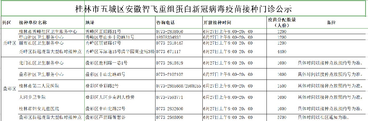 6月27日桂林市五城区,安徽智飞重组蛋白新冠病毒疫苗接种门诊,全天提供接种服务。请广大市民朋友及时预约接种,第二剂次重组疫苗(CHO细胞)安徽智飞新冠病毒疫苗,五城区接种点信息如下图: