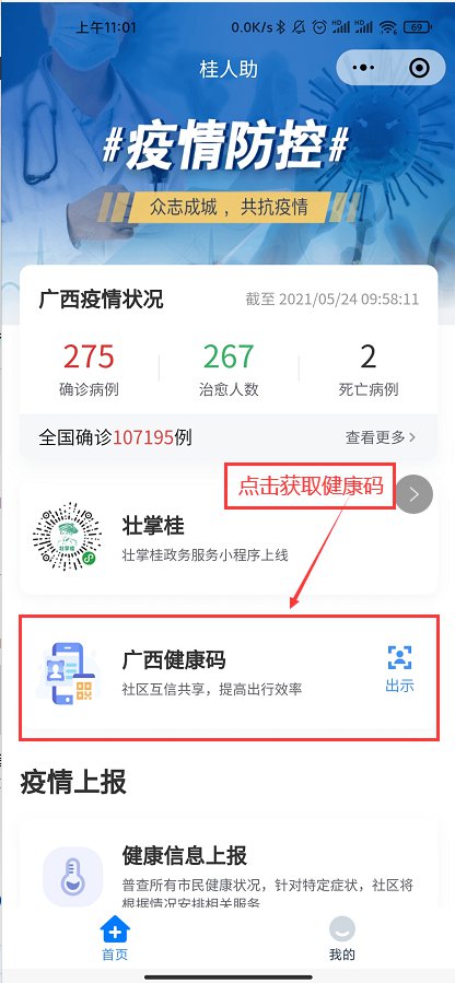 (对于首次生成健康通行码的用户,需要填报个人信息获取健康码;二次以后使用点击“广西健康码即可直接获取”)