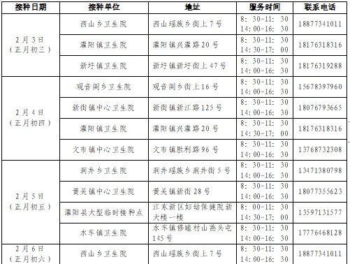 为有序做好我县春节假期新冠病毒疫苗接种工作,经研究确定,各接种单位2022年1月31日至2月2日放假三天,2月3日至2月6日轮流提供新冠病毒疫苗接种服务。具体服务时间公告如下: