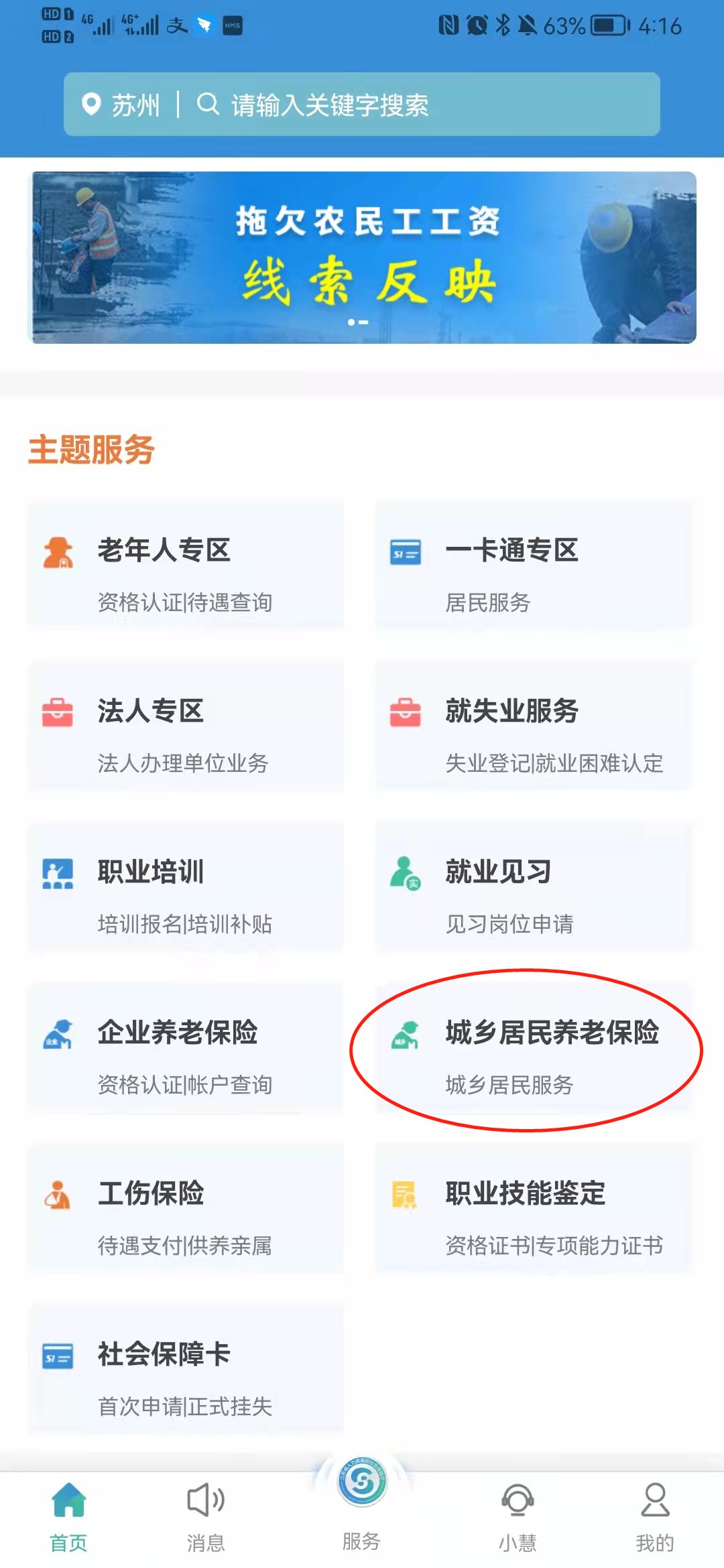 第四步,在首页“主题服务”栏中,点击“城乡居民养老保险”菜单;