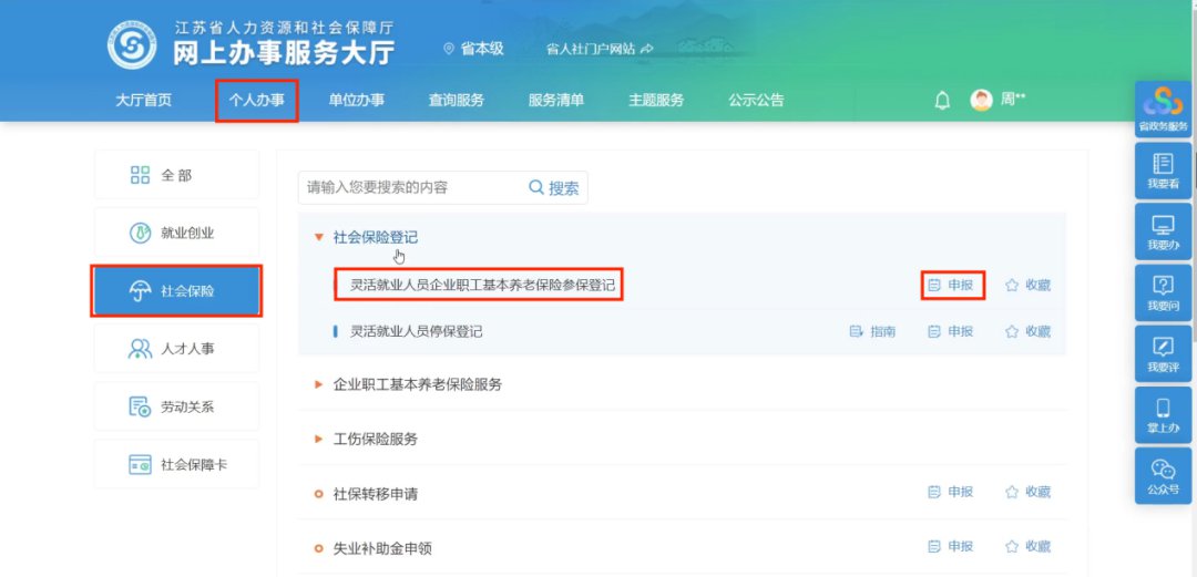 2、个人办事>社会保险>社会保险登记>灵活就业人员企业职工基本养老保险参保登记,点击"申报"。