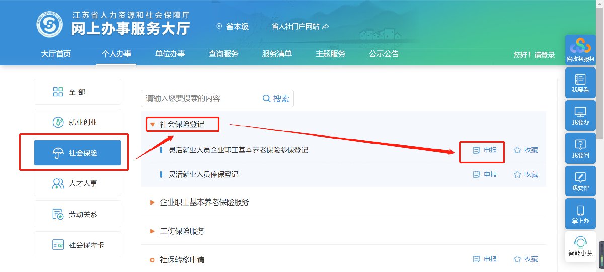 (二)登陆江苏人社网上办事服务大厅(https://rs.jshrss.jiangsu.gov.cn),点击“个人办事”—“社会保险”,选择“社会保险登记”—“灵活就业人员参保登记”,点击“申报”。