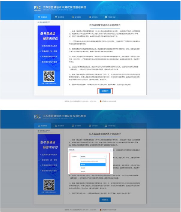 2.仔细阅读”江苏省国家普通话水平测试简介”,点击下方“我要报名”按钮,结合自身实际情况在弹窗中选择所在地。