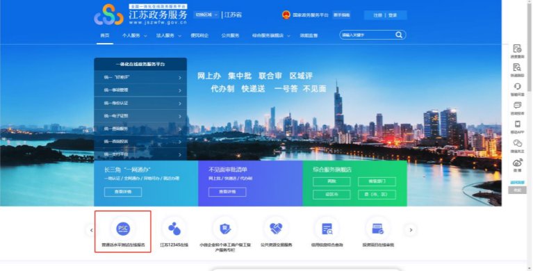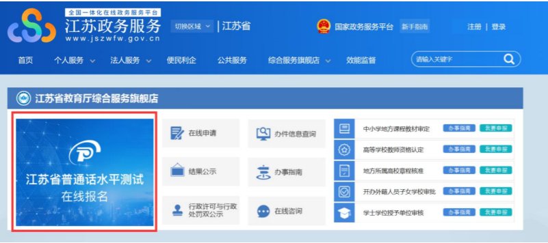 1.在江苏政务服务网首页,横向滚动菜单区域,或在“综合服务旗舰店——省教育厅旗舰店”中找到“江苏省普通话水平测试在线报名”,点击进入。