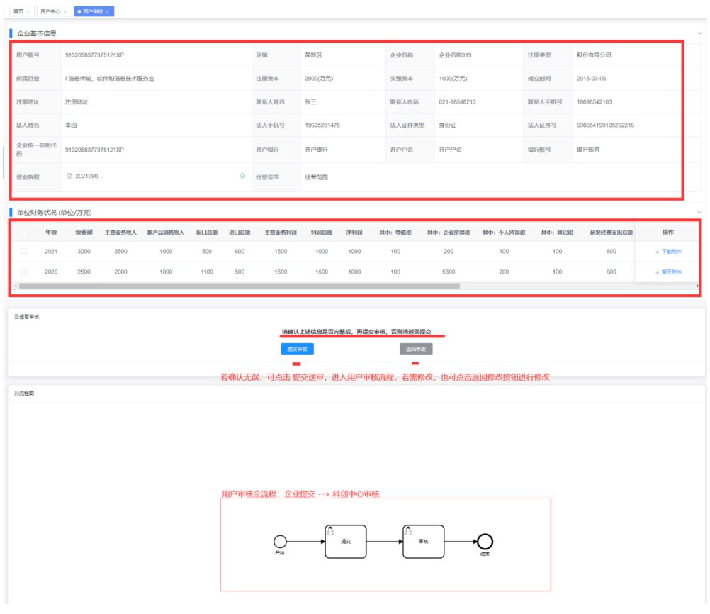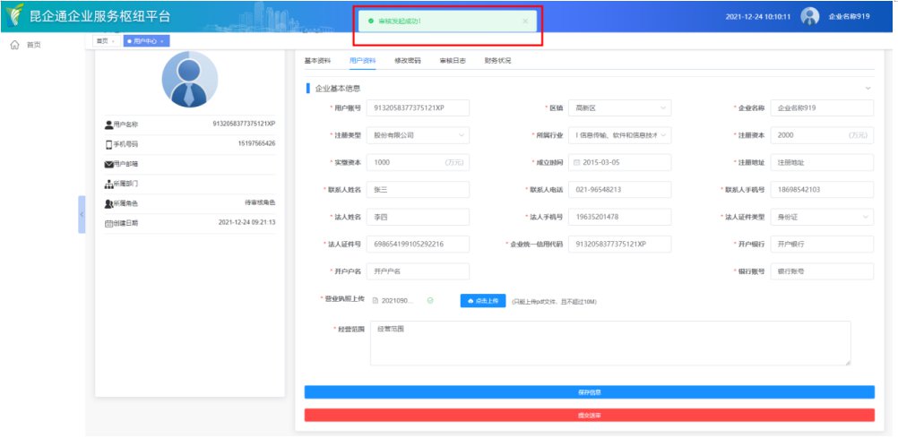 信息保存成功后,点击提交送审,即可进入“一企一档”资质审核流程: