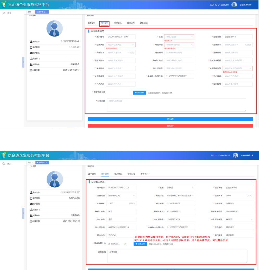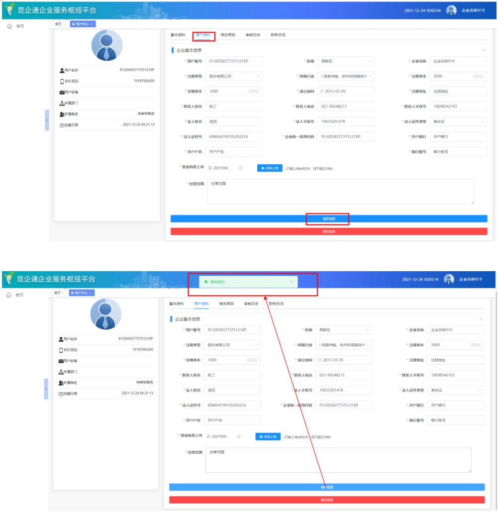 在用户中心页面,点击用户资料,根据自身实际情况填写企业基本信息: