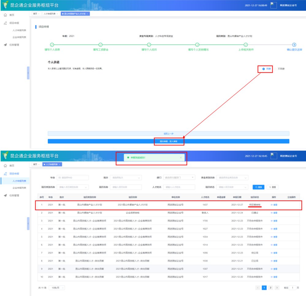 进入项目申报-确认提交送审页面后,如果以上所有流程步骤相关信息均无误后,在此页面个人承诺处点击同意,然后点击“提交申报,进入审核”按钮,页面将提示“申报发起成功!”,并进入人才申报列表页面。