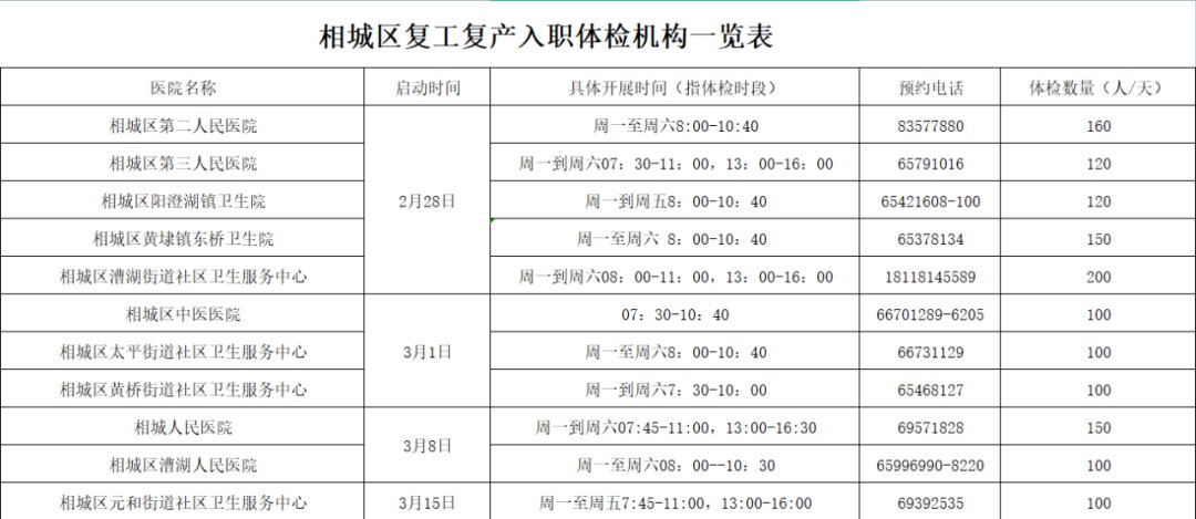 | 医院名称 | 启动时间 | 具体开展时间(指体检时段) | 预约电话 | 体检数量 (人/天) |
