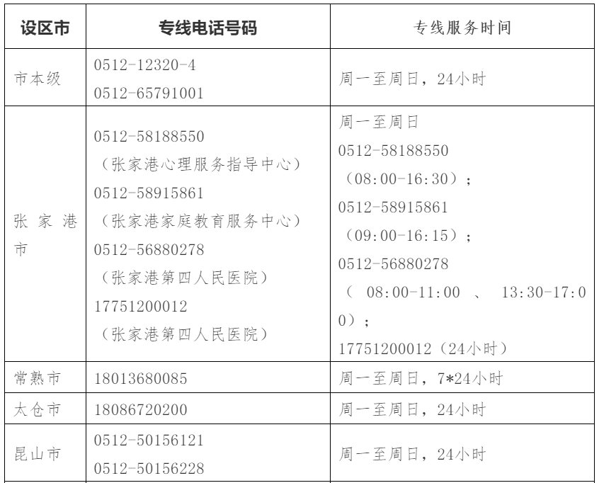 心理援助热线:0512-67168525;0512-67160093;服务时间每天8:00-24:00,周末不休。