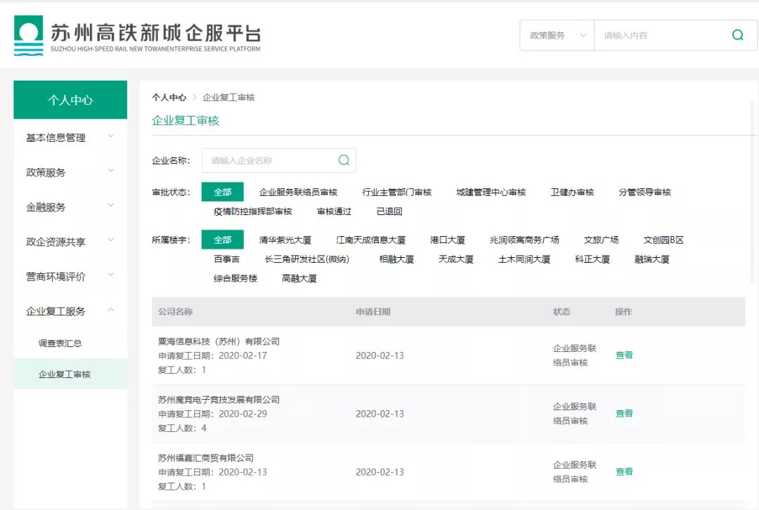 为了让具备条件的企业更快捷、更安全地复工复产,借助去年年底推出“苏州高铁新城企服平台”,高铁新城辖内企业实现了——“不见面申报审批” 当日可获批复工。