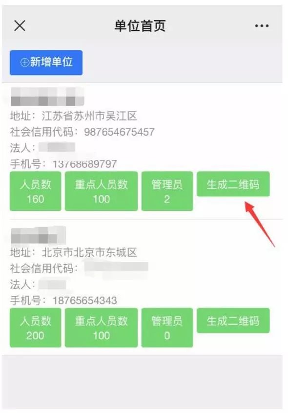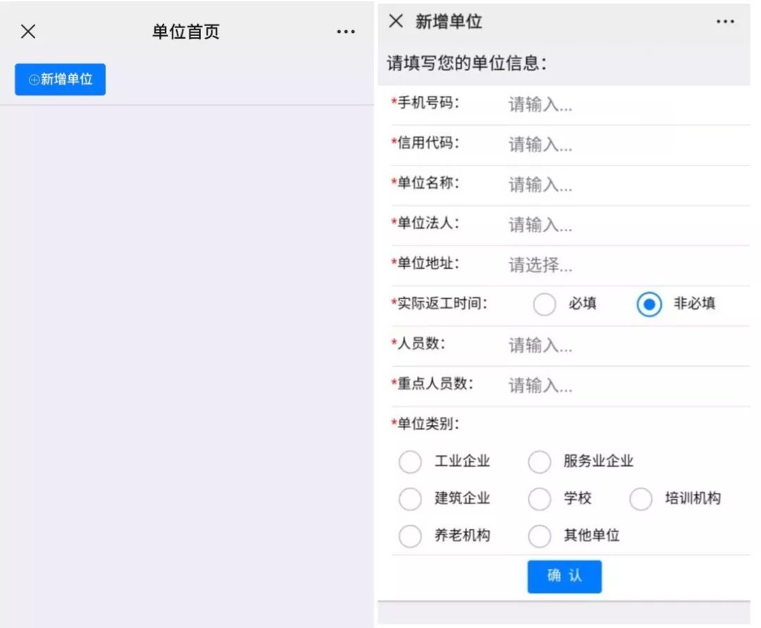 (*温馨提示*:企业首次登录后点击【新增单位】完善企业信息。其中,【实际返工时间】字段:若单位员工都已返回选择必填。)