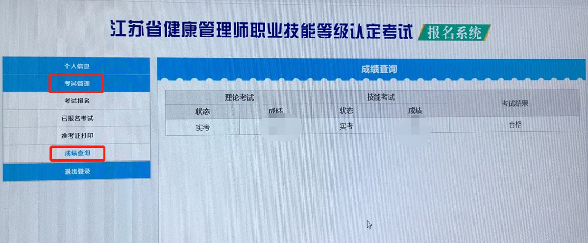 第一步:进入江苏省健康管理师职业技能等级认定考试报名系统(http://jkgls.tstnj.cn/),点击『成绩查询』