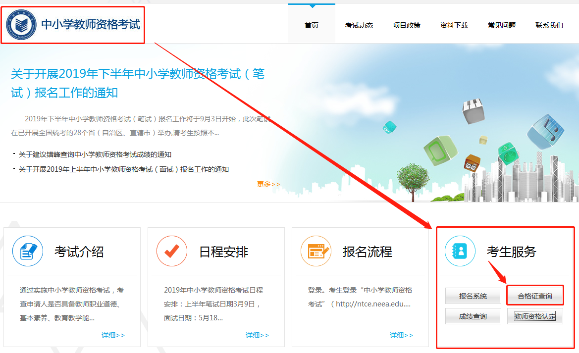 进入中国教育考试网首页,找到考生服务模块中的合格证查询,点击合格证查询。