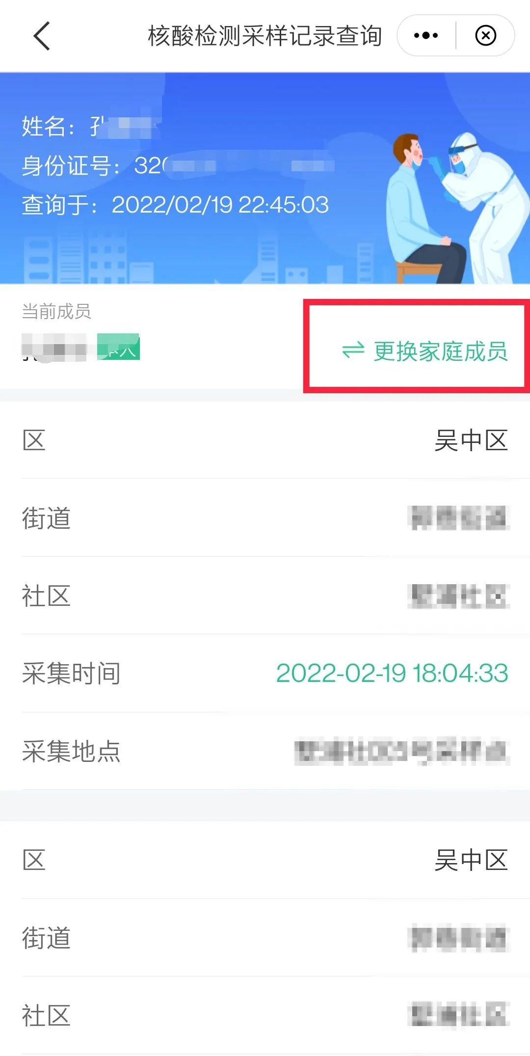 3、进入核酸检测采样记录或结果查询页面选择“更换家庭成员”