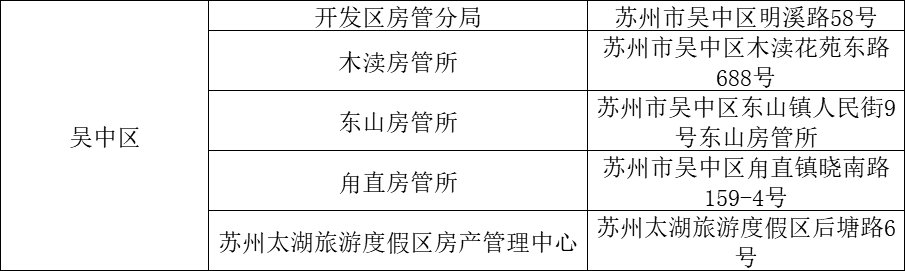 | 吴中区 | 开发区房管分局 | 苏州市吴中区明溪路58号 | |