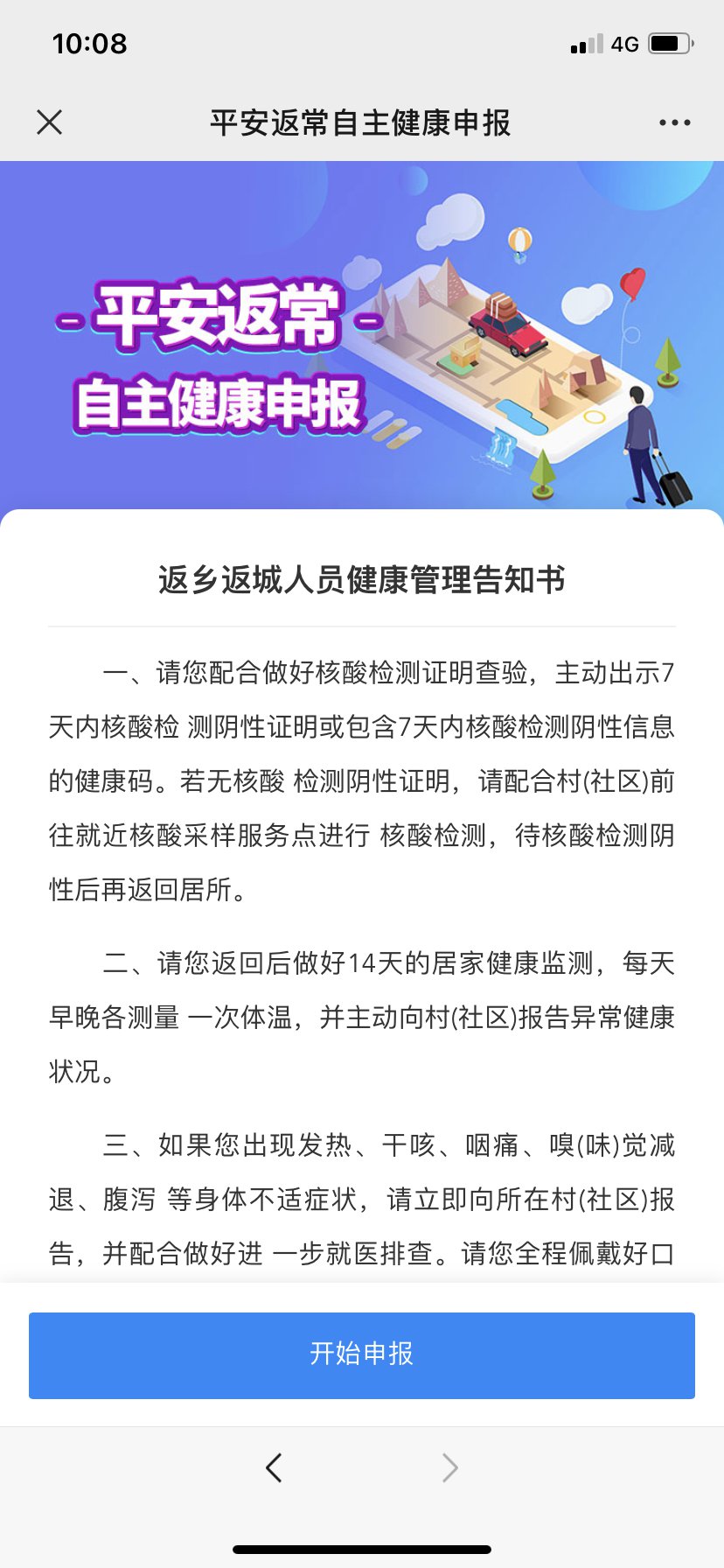 返常人员除了到(村)社区进行报到还可以登录“平安返常自主健康申报”系统如实填写相关信息并按照规定进行居家健康监测。