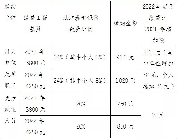 明确2022年1月1日至12月31日,全省职工基本养老保险缴费工资基数下限按4250元执行,缴费工资基数上限暂按21821元执行;