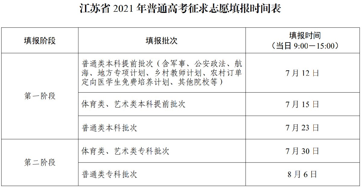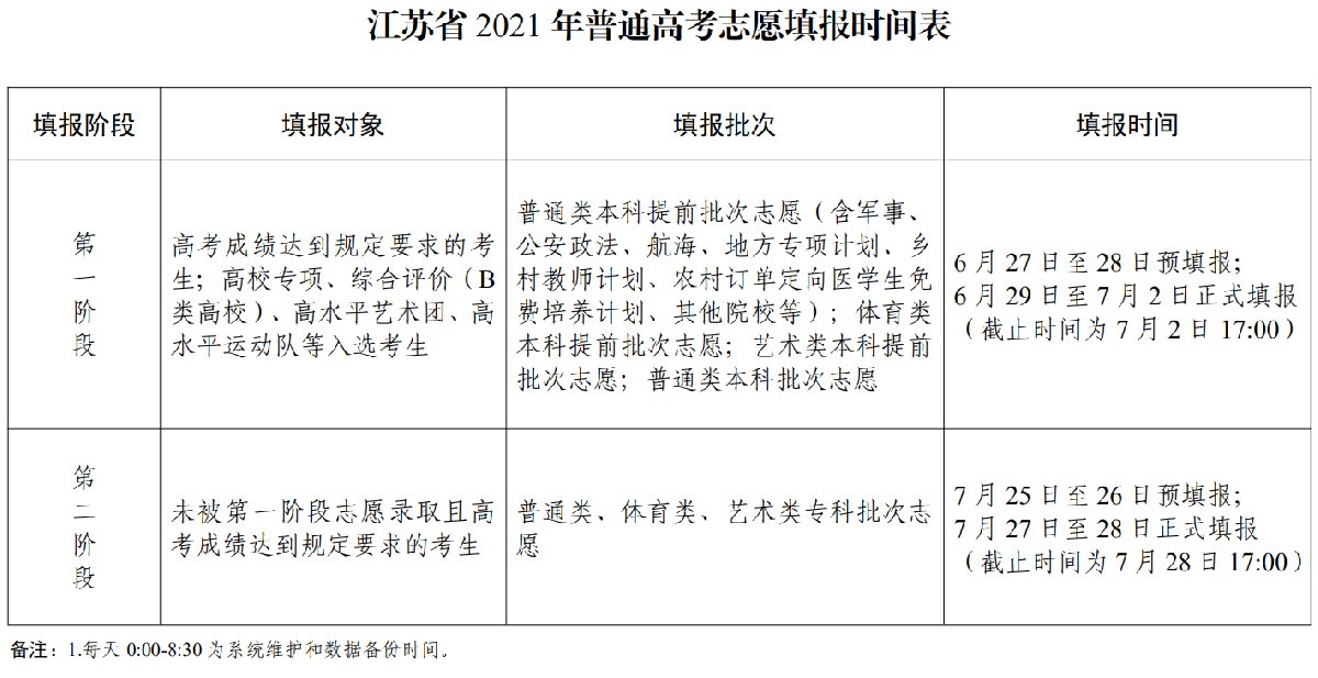 1.考生在获知高考成绩、学业水平考试成绩、各批次录取控制分数线、逐分段考生人数后,在省教育考试院门户网站(www.jseea.cn)或专设网站(gkzy.jseea.cn),分两个阶段进行网上志愿填报。第一阶段:填报本科院校专业组志愿。其中,6 月 27 日至 28 日预填报,6 月 29 日至 7 月 2 日正式填报(截止时间为 7 月 2 日 17:00)。包括普通类本科提前批次志愿(含军事、公安政法、航海、地方专项计划、乡村教师计划、农村订单定向医学生免费培养计划、其他院校等)、体育类本科提前批次志愿、艺术类本科提前批次志愿、普通类本科批次志愿。此外,我省还专门设立了高校专项、综合评价(B类高校)、高水平艺术团、高水平运动队等特殊类型招生志愿填报栏,供获得相应资格的考生填报志愿。第二阶段:填报专科批次院校专业组志愿。其中,7 月 25 日至 26 日预填报,7 月 27 日至 28 日正式填报(截止时间为 7 月 28 日 17:00)。包括普通类、体育类、艺术类专科批次志愿。具体时间安排详见下表。