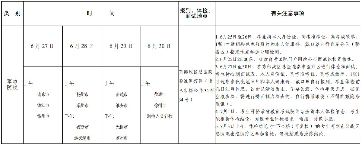 1.有意报考军事院校、成绩达到规定要求的考生,须参加政治考核、心理检测、面试和体格检查。6 月 11 日至 22 日,考生可从省教育考试院门户网站下载或到县(市、区)人武部领取《江苏省军队院校招收普通高中毕业生政治考核表》,填报个人信息,并按顺序到高中、派出所审核盖章后报送人武部。6 月 22 日前,各县(市、区)人武部会同县级招生办公室、考生户籍所在地(异地考生为中学所在地)派出所和所在中学(报名点)对拟报考军事院校的考生进行政治考核。6 月 25 日至 26 日各军分区(警备区)集中组织考生进行心理检测。6 月 27 日至 30 日,成绩达到规定要求的考生需持心测面试表、本人身份证、准考证、高考成绩单、1 张 1 寸近期彩色免冠照片和本人健康码,戴口罩到东部战区总医院 秦淮医疗区(南京市杨公井 34 标 34 号),参加由省军区组织的面试和体格检查。