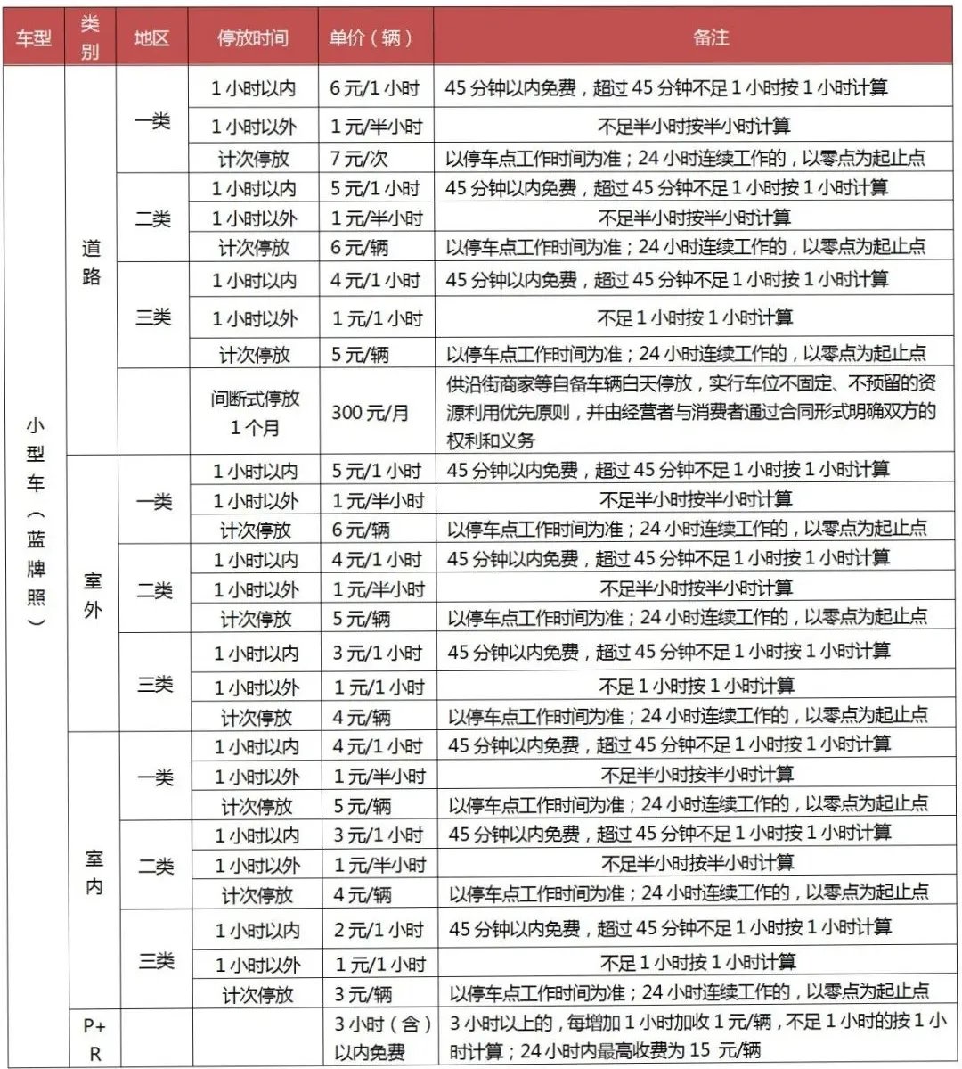 我们将停车场所划分为道路、室外、室内和P+R四个类别,同时根据停车资源的紧张程度将我区划分为三类区域,按照“中心高于外围、路内高于路外、地上高于地下、白天高于夜间、大型车高于小型车”以及不高于苏州市区三类地区标准的原则,实行差别化停车收费标准,具体可见下图。道路停车泊位收费实行政府定价,经营者必须严格执行公布的收费标准。实行政府指导价的机动车停放服务收费可在公布的收费标准基础上向下浮动,幅度不限。