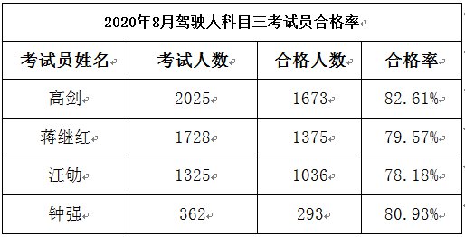 各科目考试合格率(合格人数与考试人数之比)分别:科目一74.80%、科目二75.60%、科目三80.48%、科目三安全文明常识88.96%、综合合格率79.96%。
