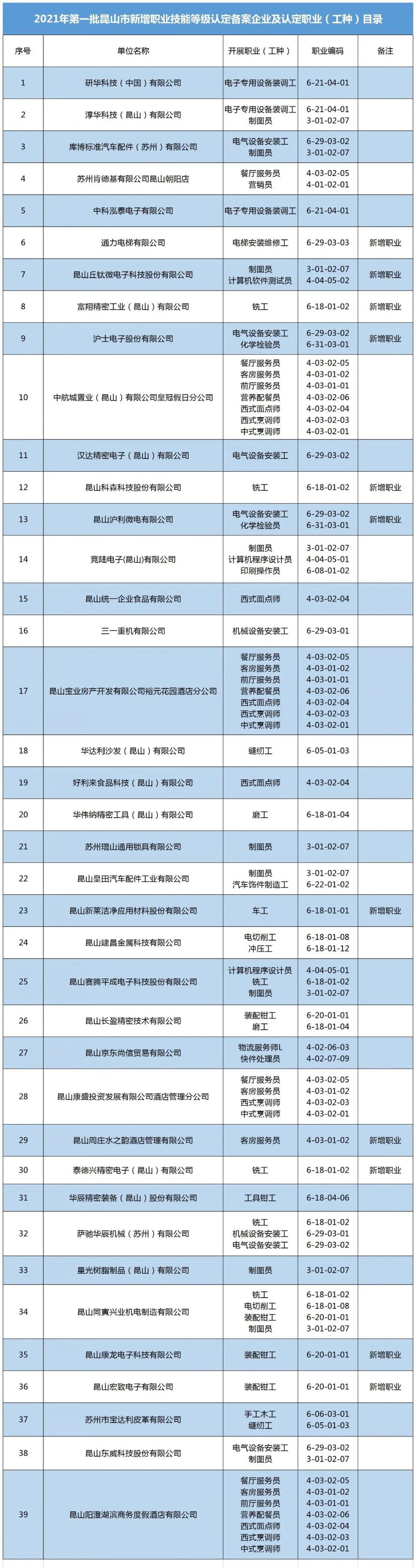 【2021第一批昆山职业技能等级认定备案企业名单及认定职业(工种)】