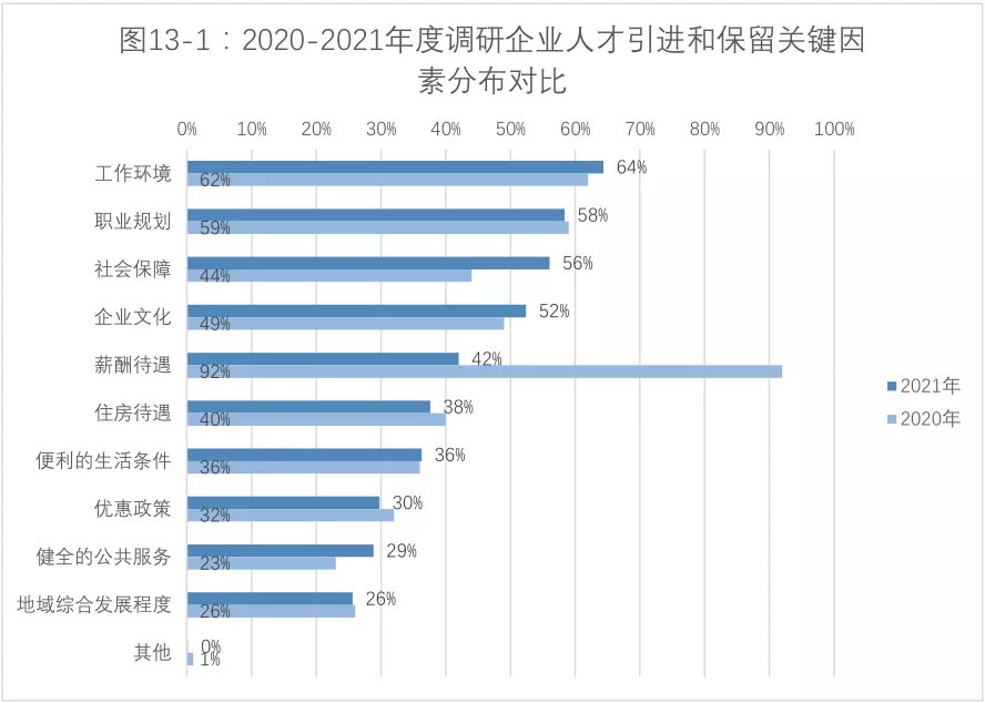 在选择人才引进和保留的关键因素时,薪酬待遇因素首次降至第六位,仅受42%的企业认同;工作环境因素首次升至第一位,获得64%的企业认同,同比增加2%;其次是职业规划、社会保障和企业文化因素,占比依次是58%、56%和52%,其中,由于疫情原因,导致社会保障因素的重要程度较去年大幅上升,同比增长12%。