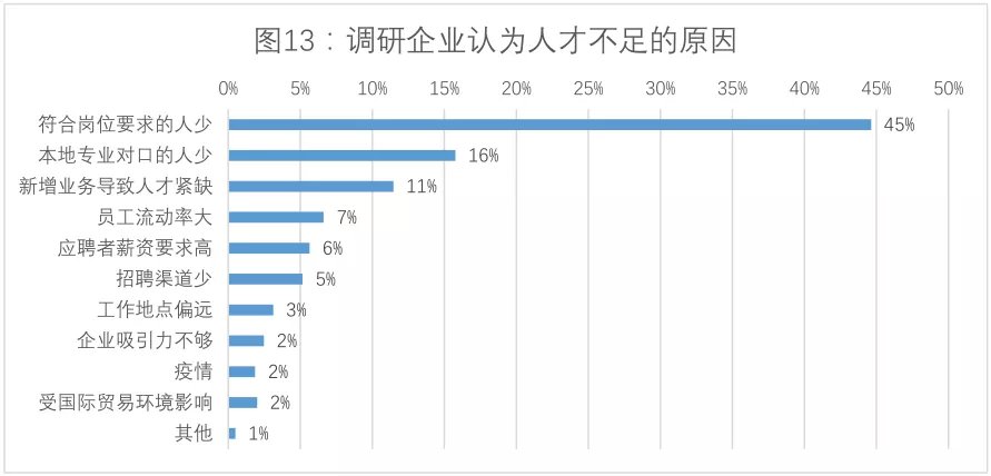 从调研企业认为人才不足的原因来看,排名前三的依次为符合岗位要求的人少、本地专业对口的人少和新增业务导致人才紧缺,分别占调研企业总数的 45%、16%和11%。此外,疫情和受国际贸易环境影响两大年度热点因素分别仅占2%,表明在人才供应方面,我市重点产业所涉企业人才的招引受疫情和国际贸易摩擦影响较小。
