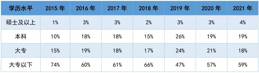 从2015-2021年调查数据分析来看,七年来全市重点产业企业员工拥有大专及以上学历人员占比增长了15%,其中硕士及以上学历人员占比首次达到4%,重点产业从业人员学历结构向高层次发展的趋势愈发显著,人才集聚效应显现,夯实了苏州人才“金字塔”的塔基,为处于“塔尖”的领军人才提供了事业发展的人才基础和支撑。