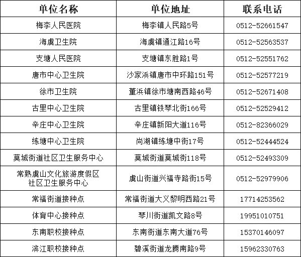 | 体育中心接种点 | 琴川街道凯文路8号 | 19951010751 |