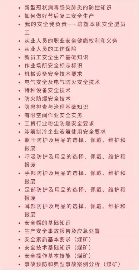 ➤ 指导企业开展线上学习教育培训。在当前疫情形势下,各市区安委办(应急局、安监局)要整合资源,引导培训机构和有条件的企业,提供线上安全教育培训课程。以更加积极稳妥、安全有效的形式,帮助企业落实岗前、复工安全学习教育培训,保障复工上岗人员综合素养符合上岗安全要求。