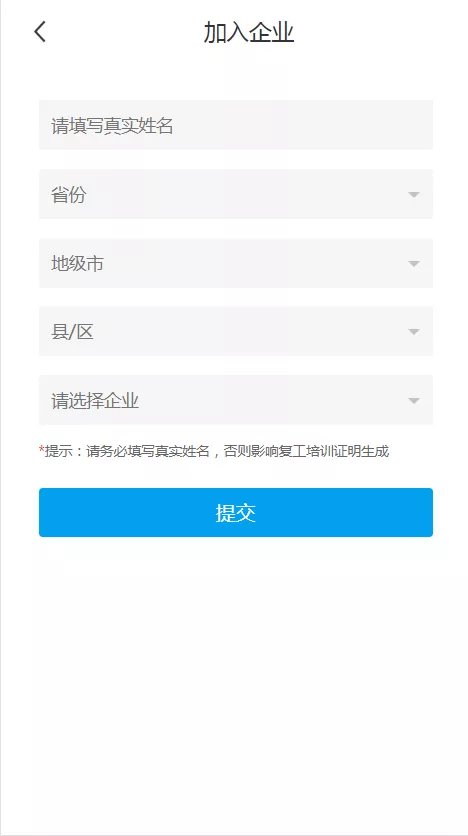 4. 填写员工姓名,选择省份、地级市、县/区,选择企业,点击提交,即可加入企业。